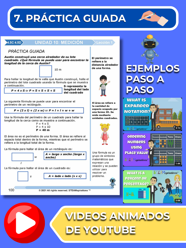 Práctica Guiada: Cada unidad incluye secciones de práctica guiada diseñadas para enseñar efectivamente nuevos TEKs/Habilidades. Estas se pueden utilizar junto con nuestros atractivos videos de instrucción animados, mejorando la experiencia de aprendizaje.