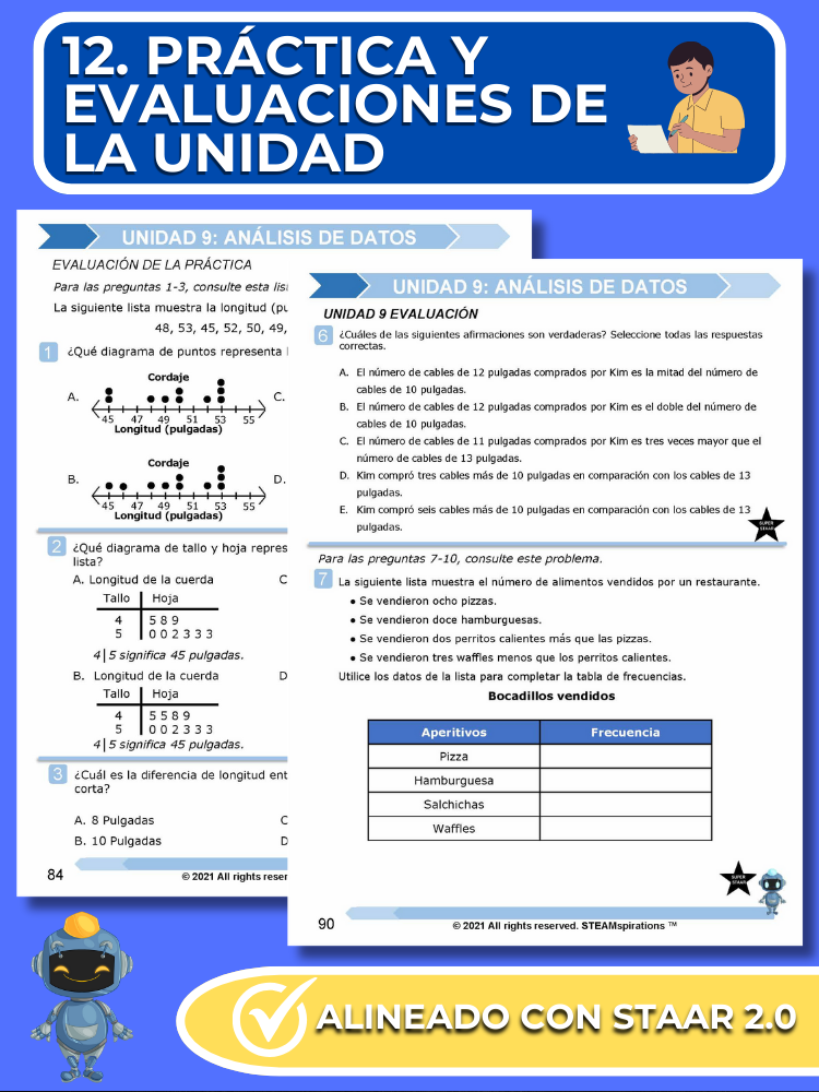 Prácticas y Evaluaciones de Unidades: Reflejando el rigor del examen STAAR, cada unidad incluye una evaluación de práctica y una evaluación de unidad integral con preguntas STAAR 2.0.