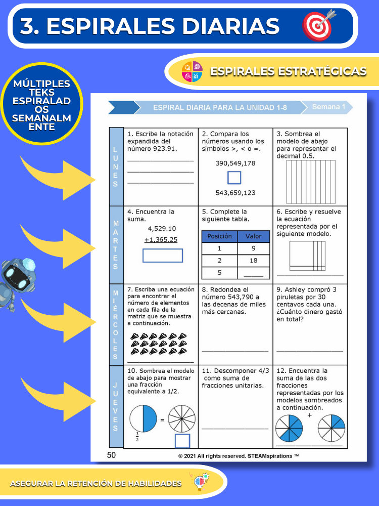 Espirales Diarias: Hemos estructurado nuestro programa de matemáticas para garantizar una revisión continua al volver a visitar todas las habilidades previamente enseñadas cada semana, asegurando así el dominio. Normalmente, para la séptima unidad, los estudiantes están revisando más de 15 habilidades quincenalmente, cubriendo todo el material de las primeras cuatro unidades. (Resaltar espiral diaria por TEKS)