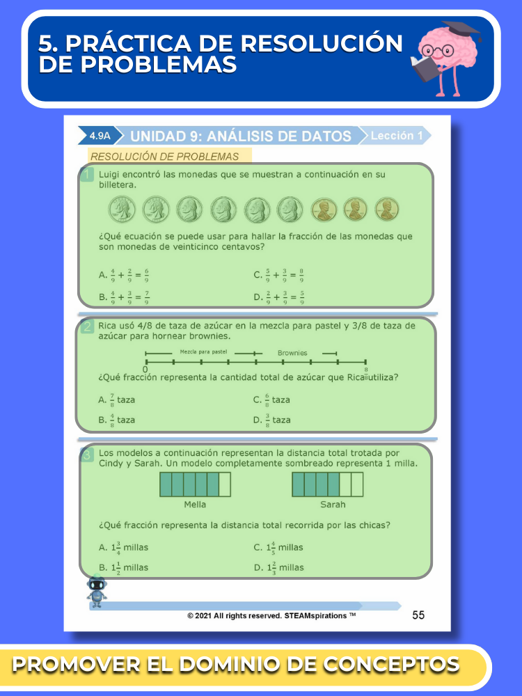 Preguntas de Resolución de Problemas: Más allá de las espirales diarias, cada lección incluye preguntas de resolución de problemas, también conocidas como preguntas del Problema del Día (P.O.D.), que refuerzan las habilidades de la lección enseñada previamente.