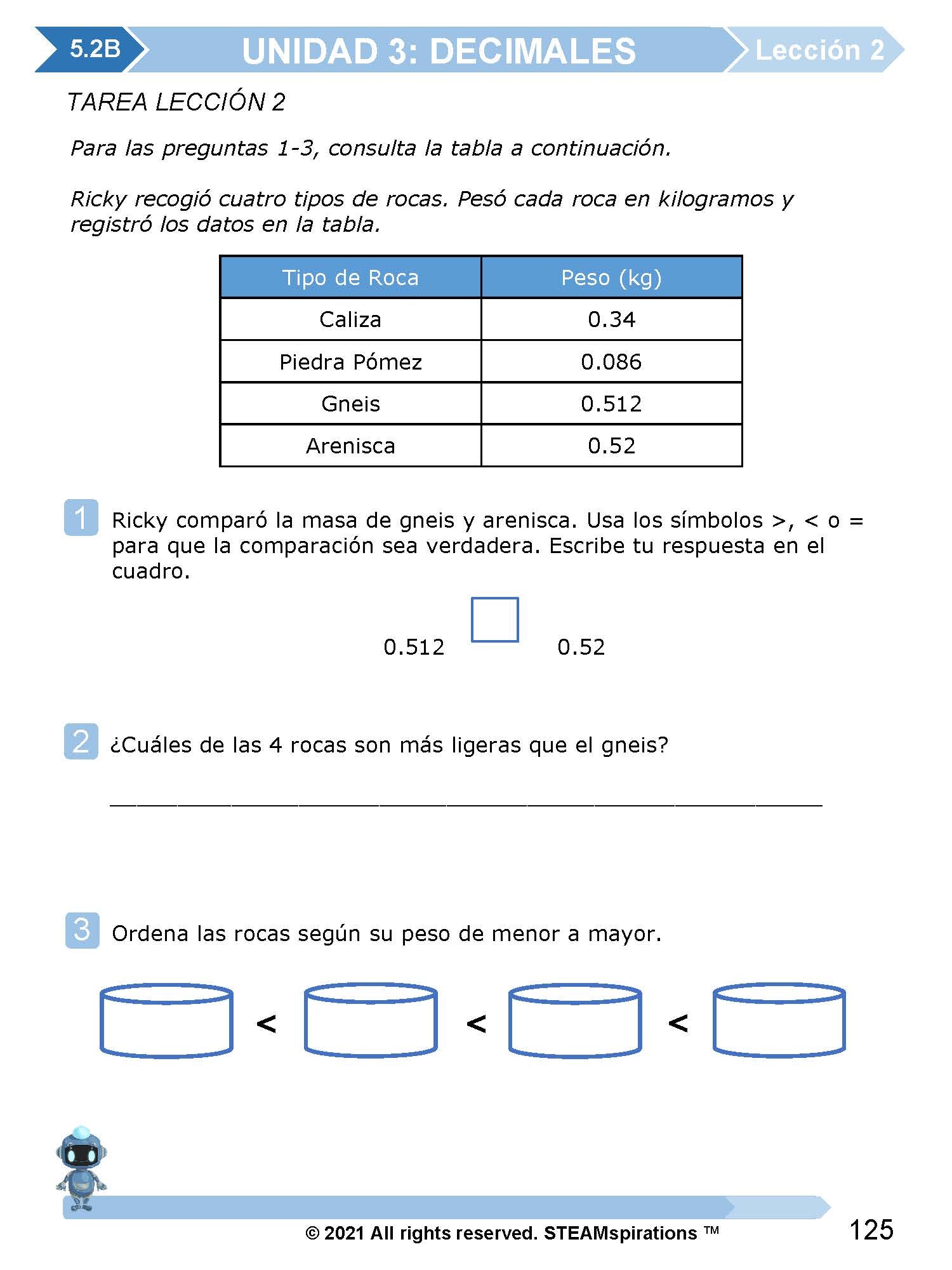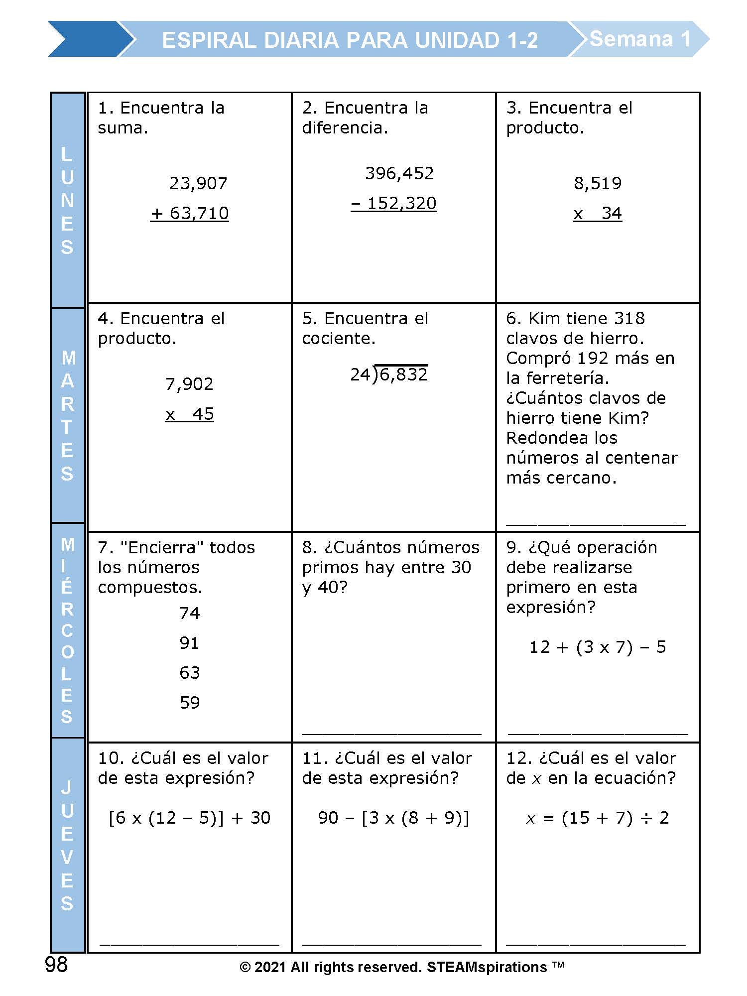 Preguntas de Resolución de Problemas: Más allá de las espirales diarias, cada lección incluye preguntas de resolución de problemas, también conocidas como preguntas del Problema del Día (P.O.D.), que refuerzan las habilidades de la lección enseñada previamente.