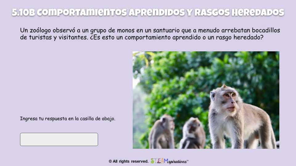 - 5.10B Diferencia entre rasgos heredados de plantas y animales, como las espinas en un cactus o la forma de un pico, y comportamientos aprendidos, como un animal que aprende trucos o un niño que monta bicicleta.