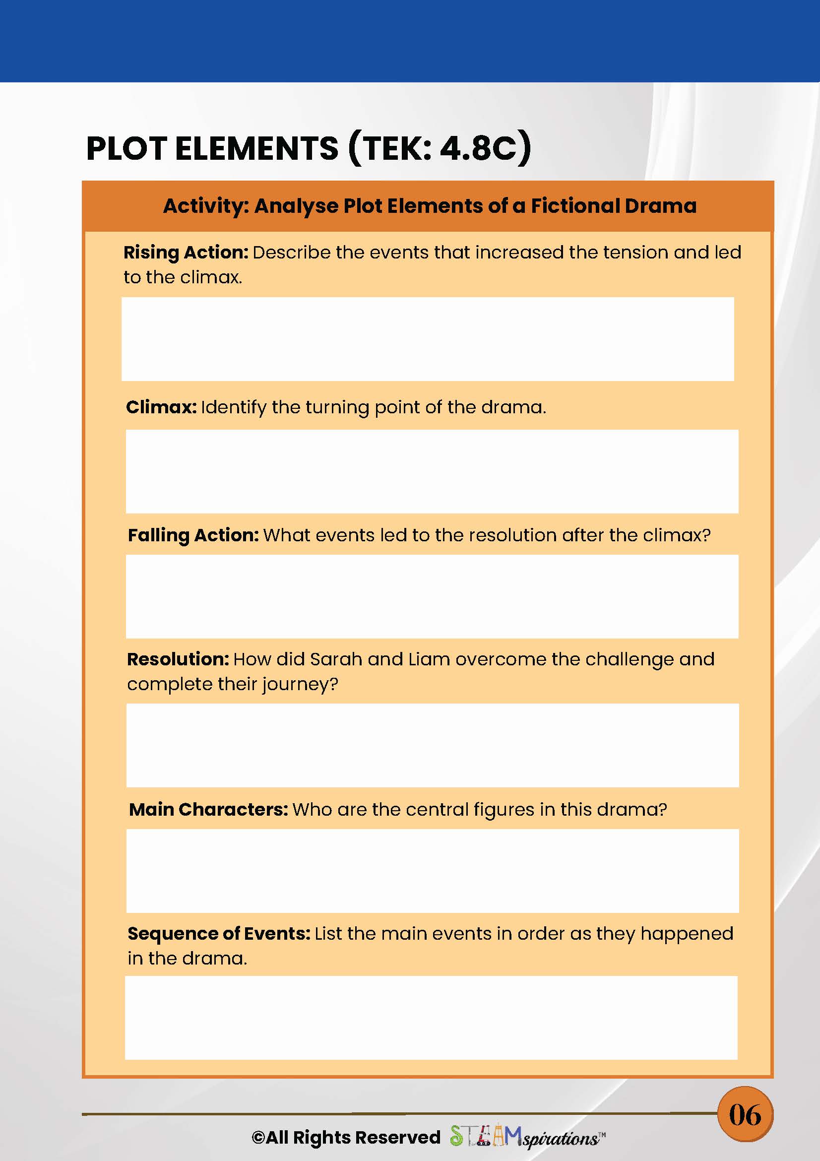 - Literary Adventures: 4.8(C) Create stories with elements like rising action, climax, falling action, and resolution.