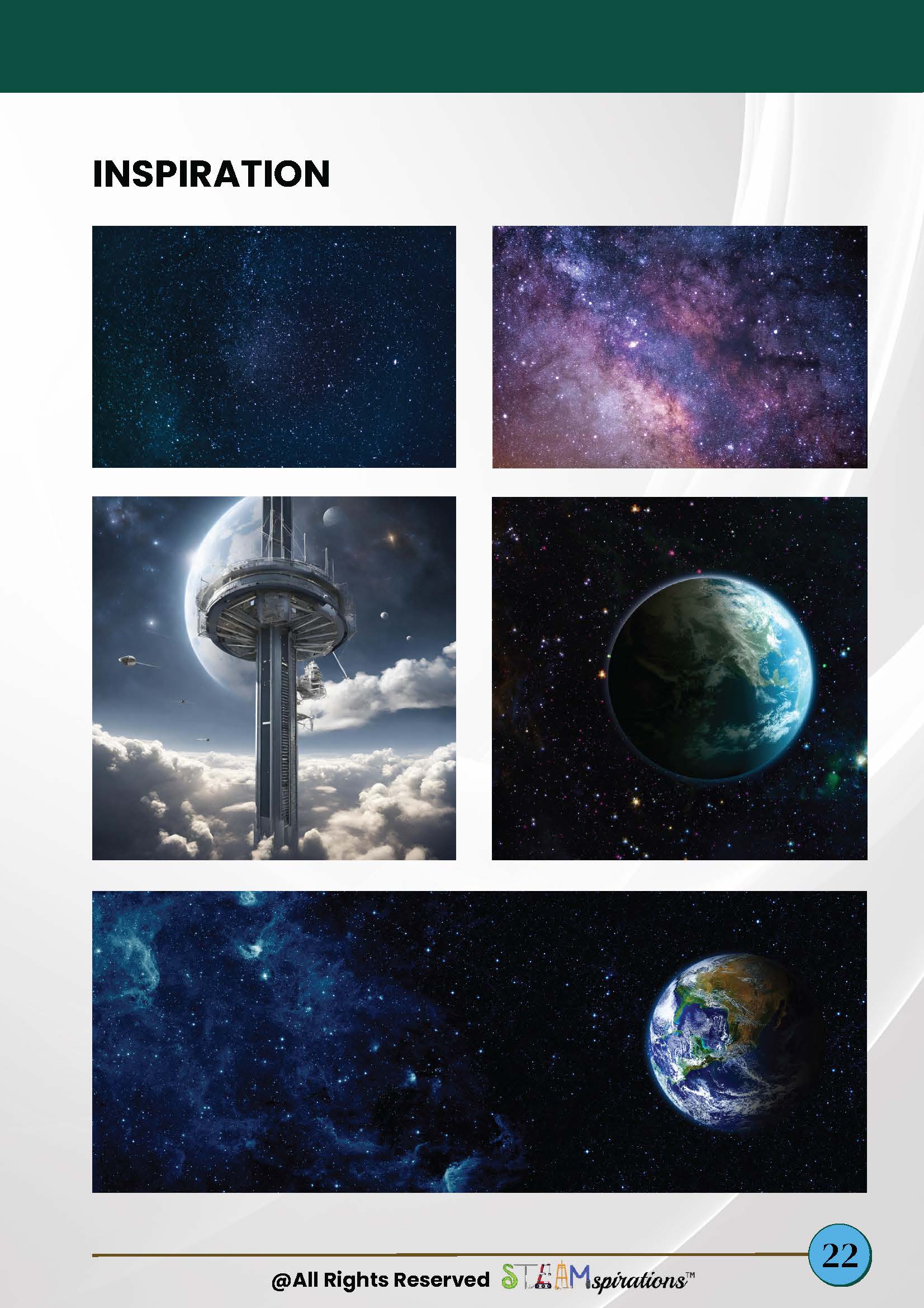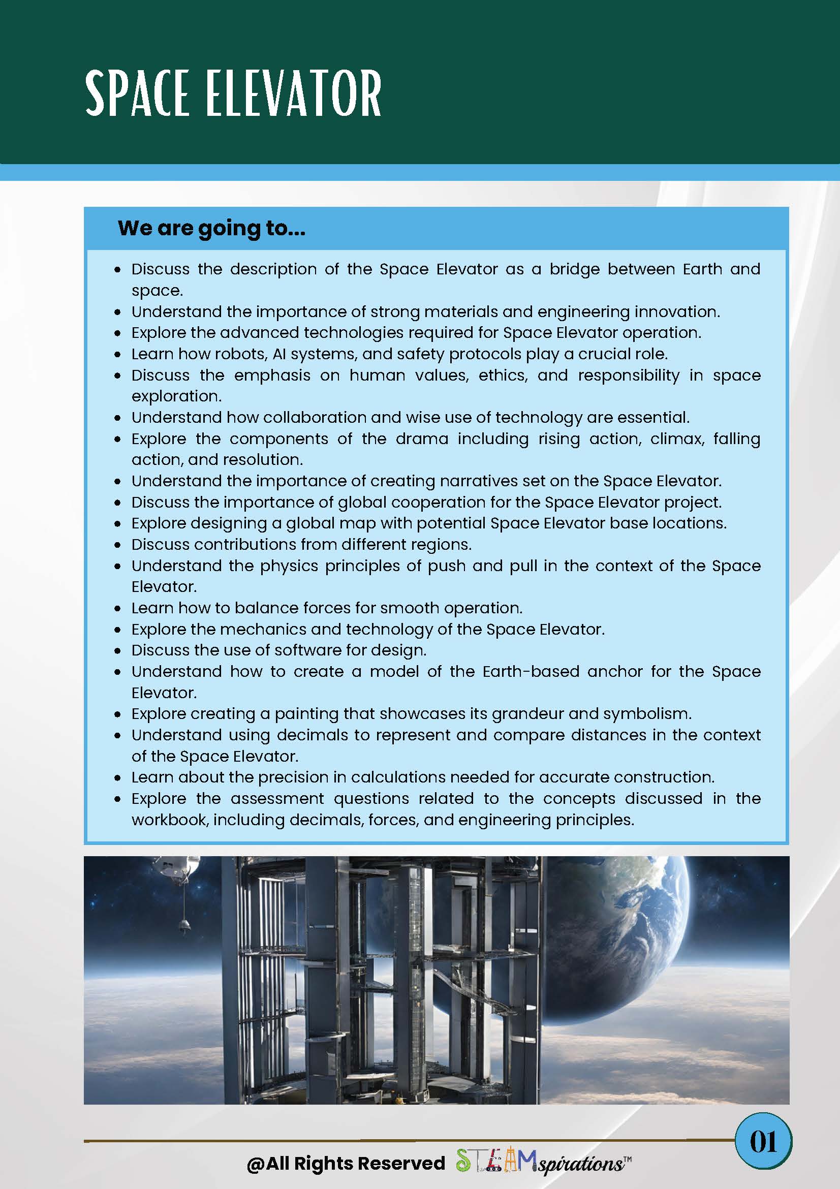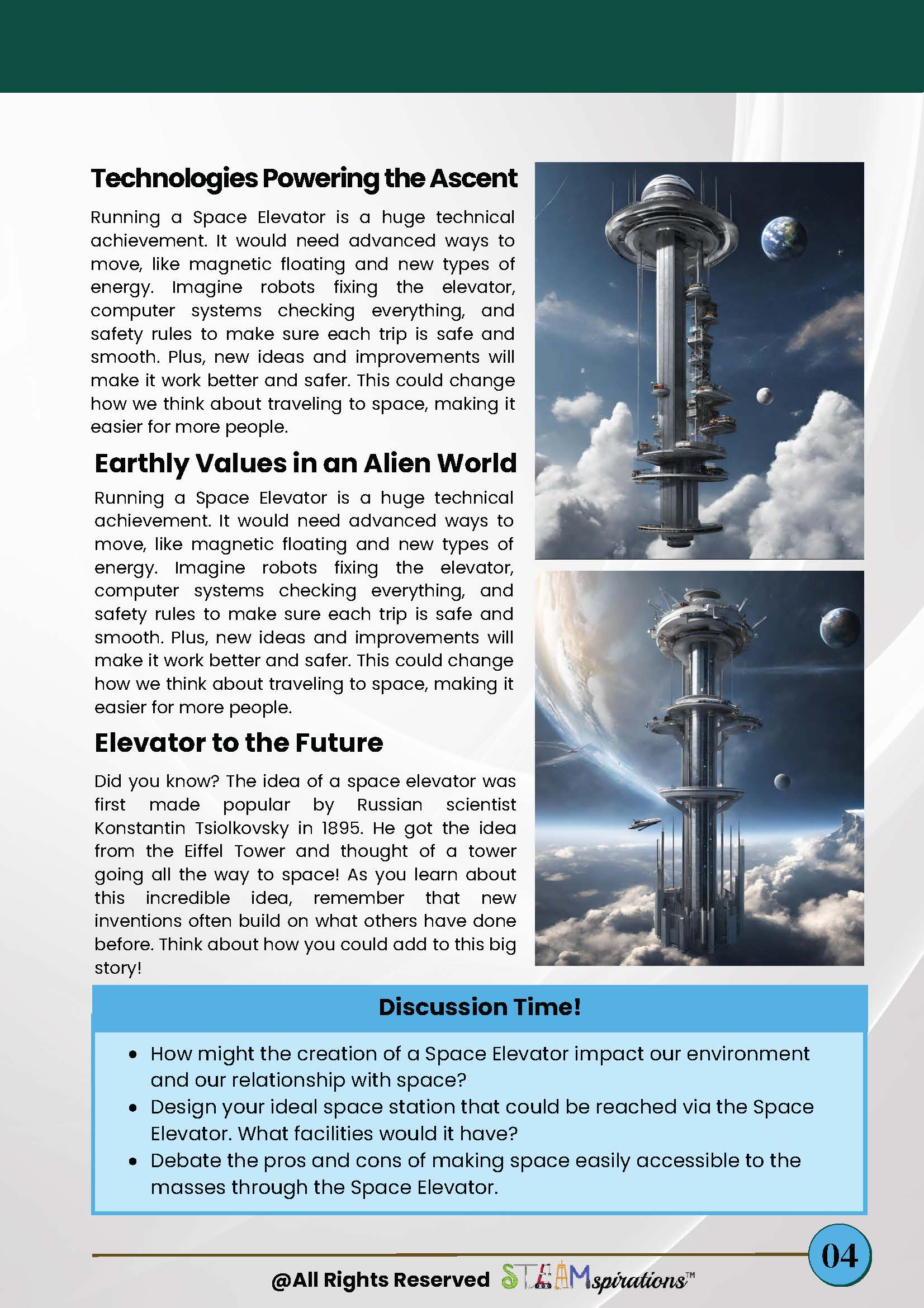 Embark on an enlightening educational journey with our interdisciplinary course focusing on the Space Elevator concept. This module, crafted for 5th graders, integrates science, technology, engineering, arts, and mathematics. It introduces students to the idea of a Space Elevator as a pivotal link between Earth and space, exploring its design, operation, and the vast potential it holds for future space exploration.
