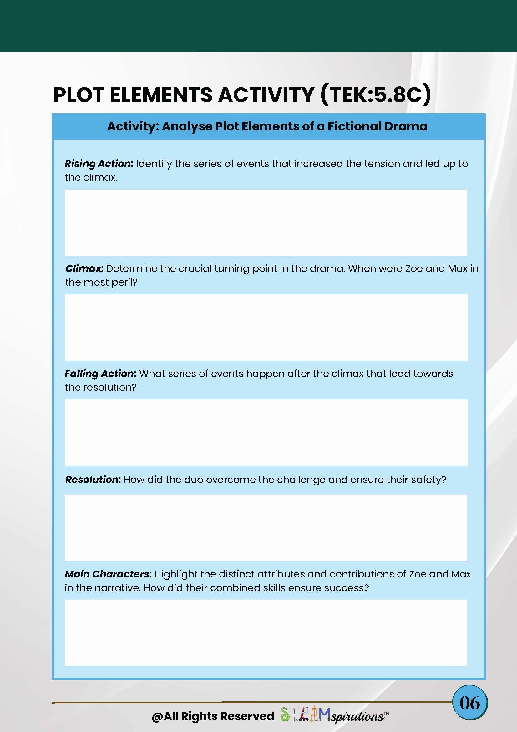 Literary Creativity: Investigate the components of drama, including rising action, climax, falling action, and resolution. Students will create narratives set on the Space Elevator, enhancing their storytelling skills and understanding of plot development.