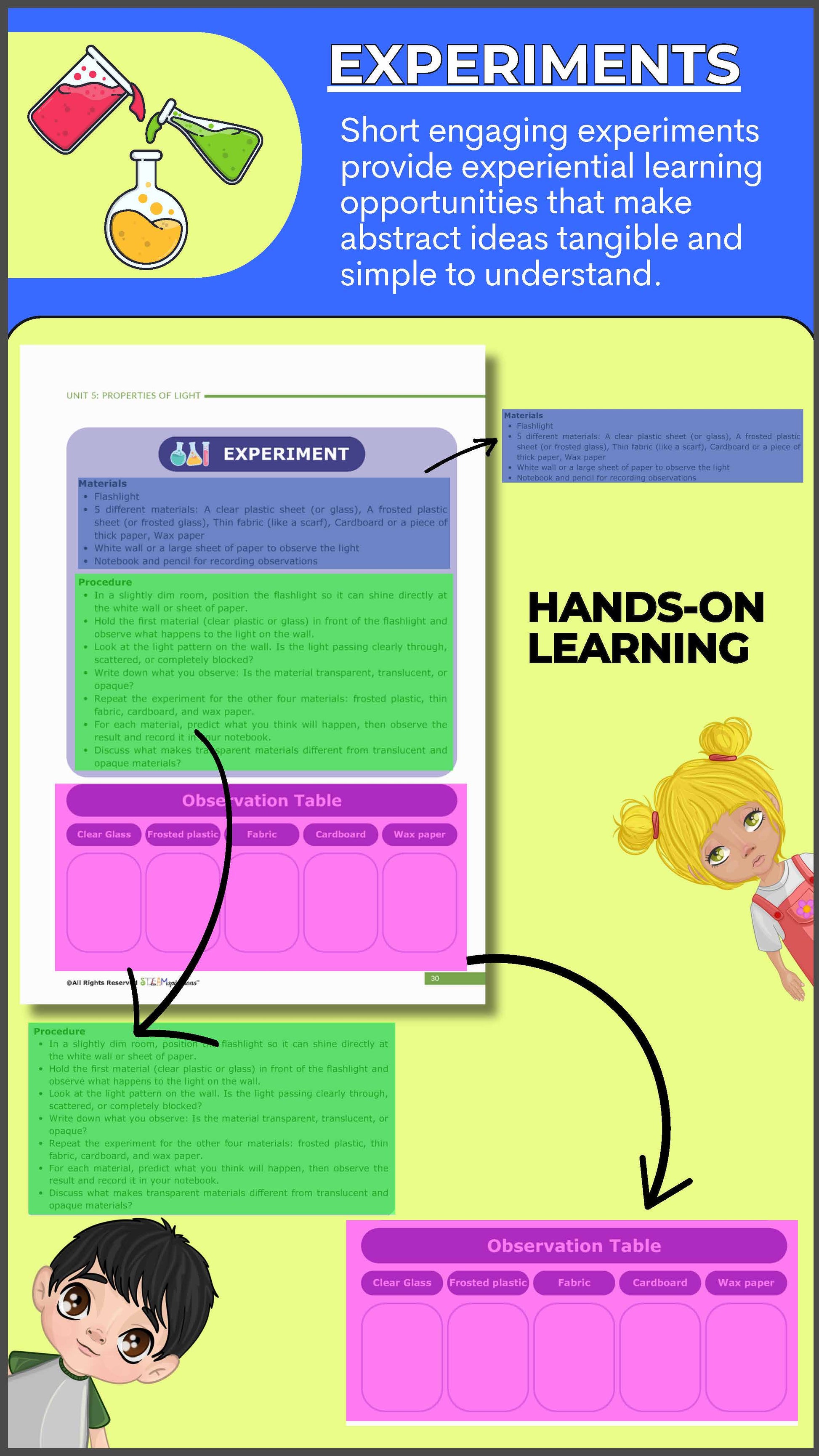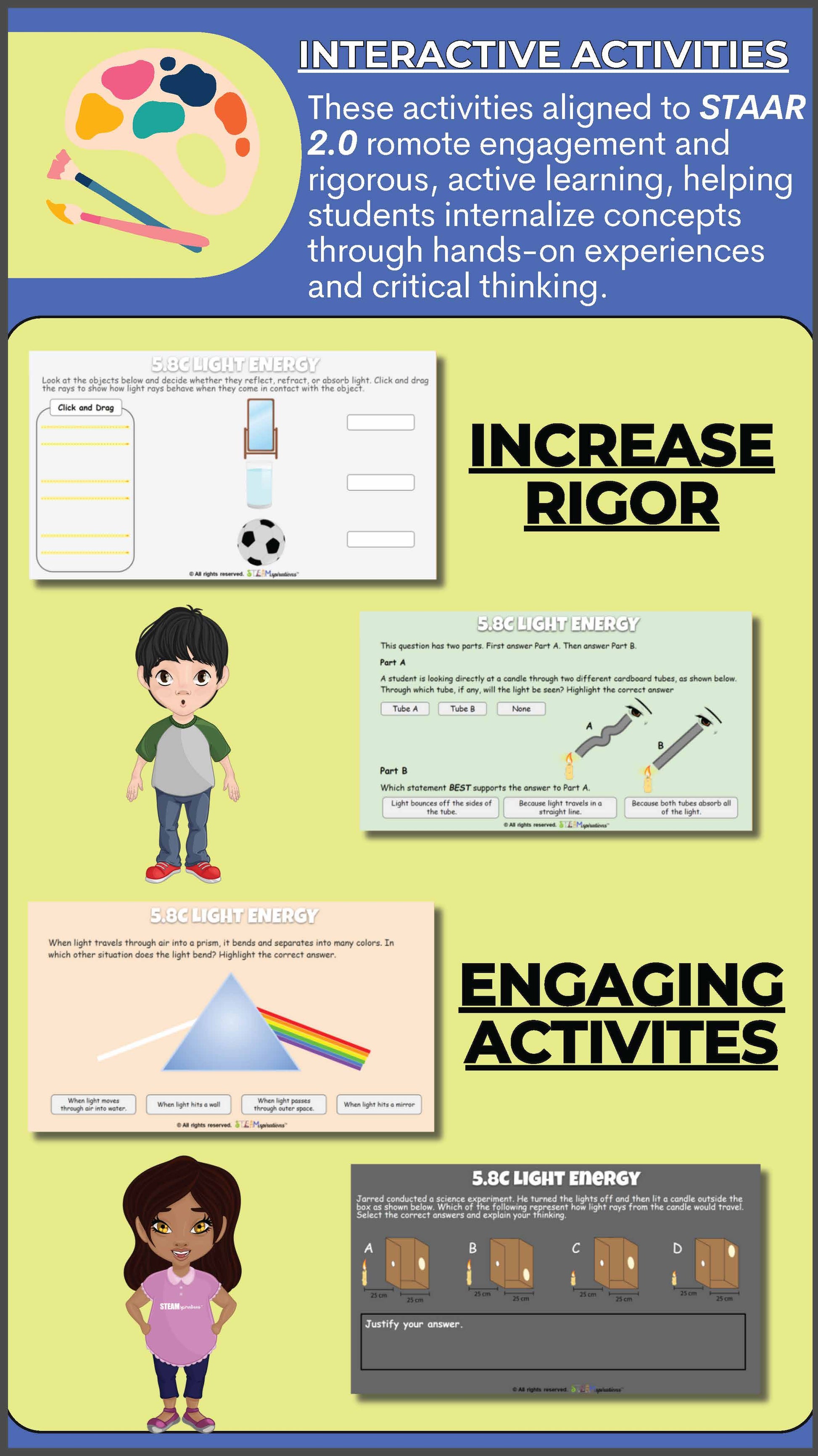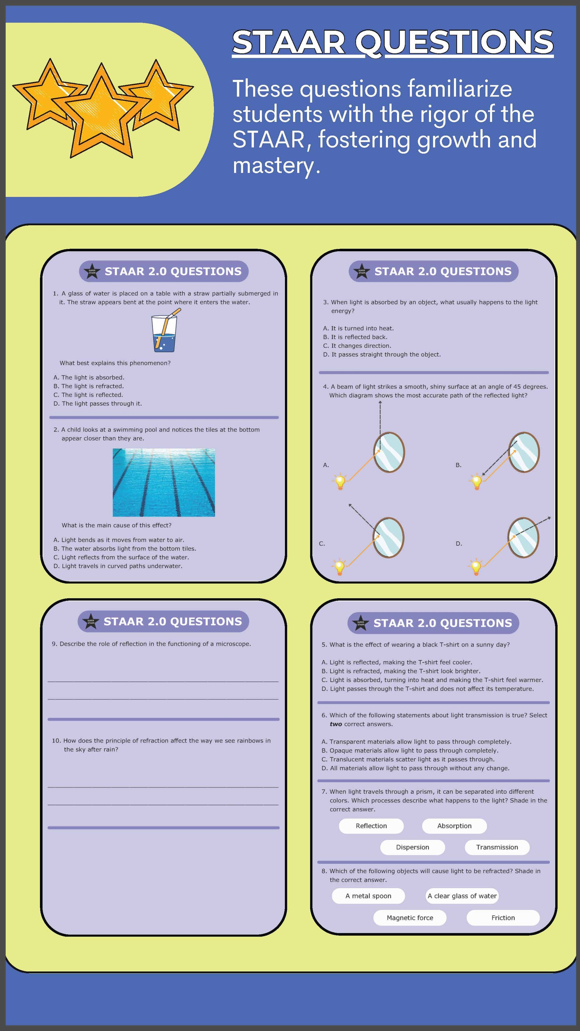 Periodic checkpoints and STAAR 2.0-aligned assessments ensure students master key concepts and build confidence in their understanding of light’s properties.
