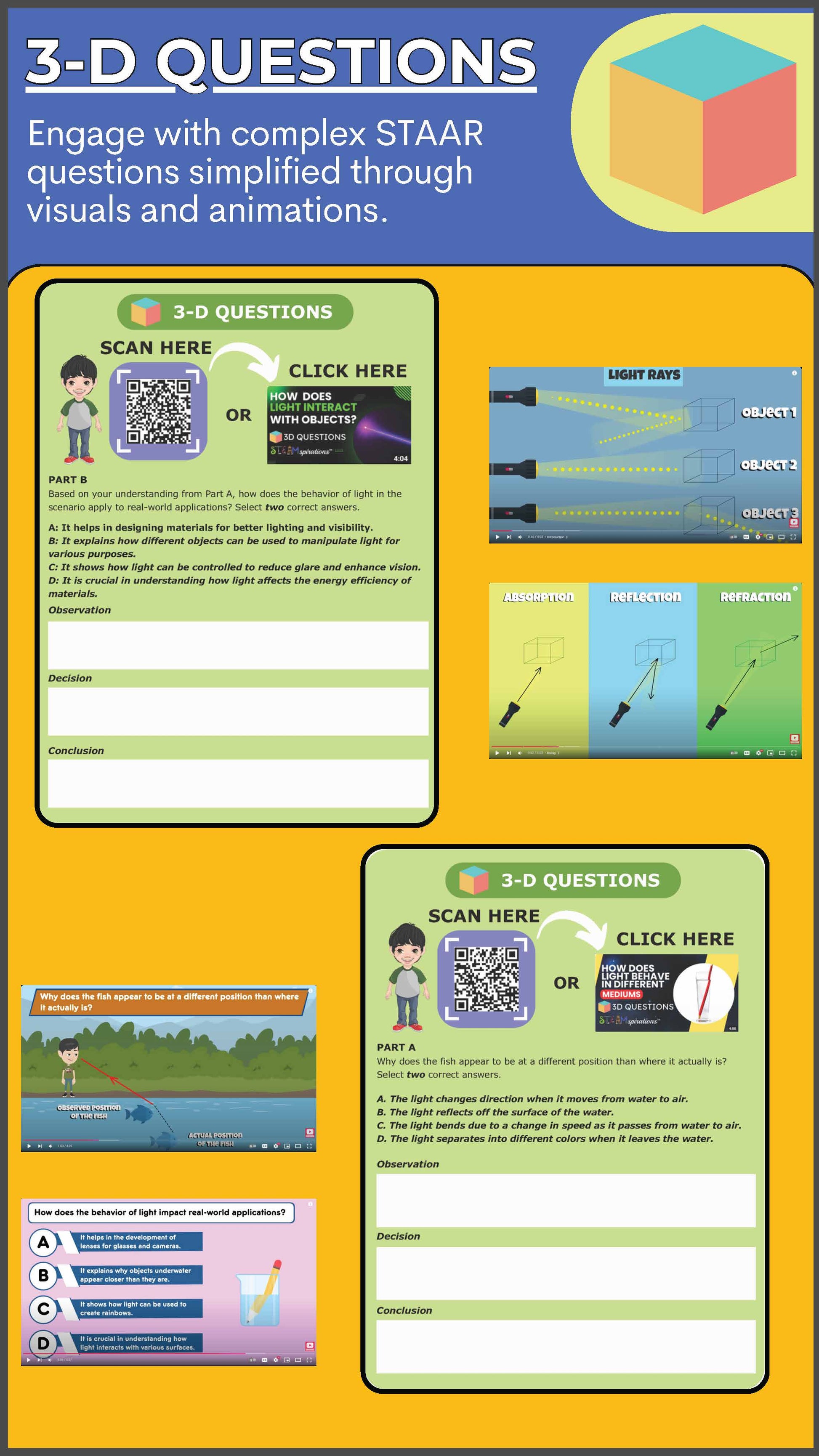 Incorporating 3-D questions, students analyze, predict, and evaluate scenarios involving light's behavior. These inquiries encourage a proactive and reflective approach to learning.